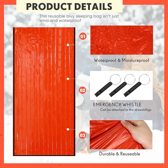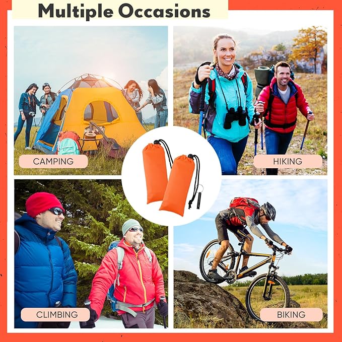 - Foldable and Portable: with a lightweight of around 2.8 ounces/ 80 g, these camping bivy sacks are easy to carry and store, plus, they come with a foldable design that fits neatly in the drawstring bags for reusable; They will not occupy much space in your pack, making them a convenient tool in your trips or emergency kit; And the whistles can be attached to the drawstrings