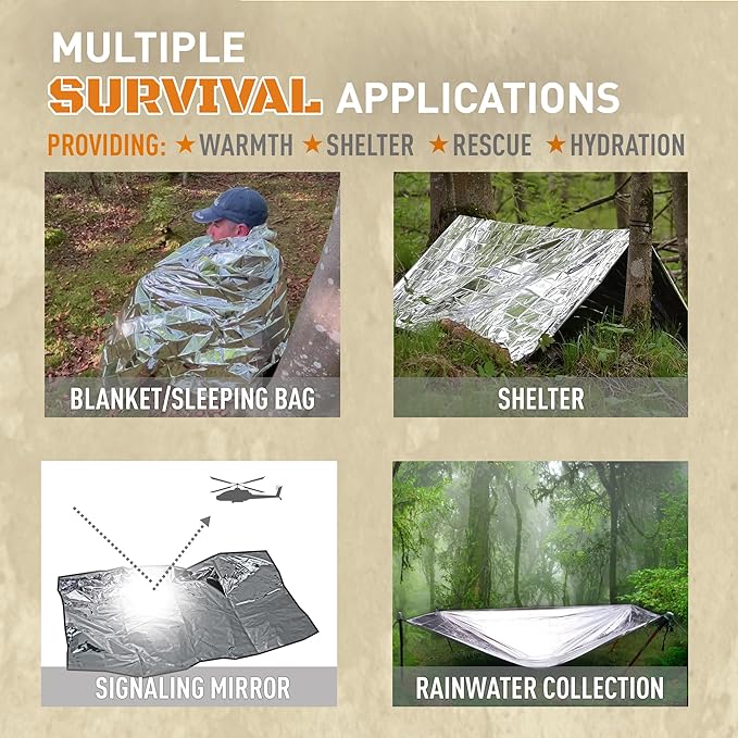 - VERSATILE USE: Besides serving as emergency blankets, they can also function as signaling devices, sunshades, trail markers, ground covers, and makeshift shelters, catering to various outdoor needs.