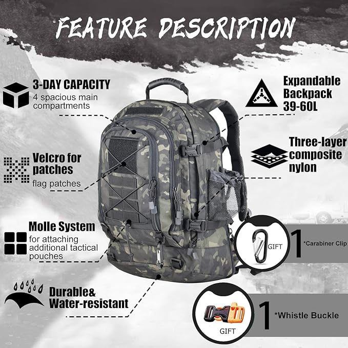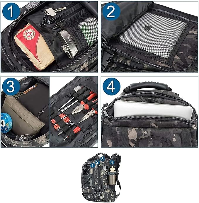 - ✅ Effective: There's plenty of compartments to store and organize your life. The pack holds 3 days worth of clothes along with toiletries and other essential gear. A solid multifunctional backpack for combat, range, survival or hunting. It is water resistant keeping everything dry in a storm.