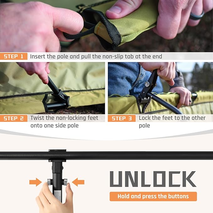 - Organized & Quick-access: camping cots for adults with roomy side pockets and MOLLE straps. The side pockets are detachable and can be moved to any seat of the side. You can keep your phone, books, water bottles, and other camp gear clean and dry. The MOLLE straps can attach camping essentials and giving you even more storage options within arm's reach.