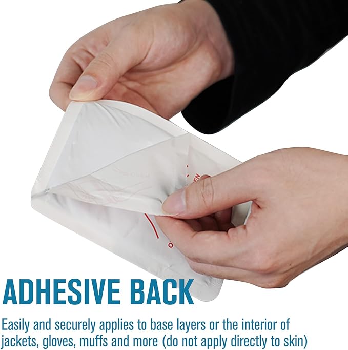 - ☀MULTI-PURPOSE WARMERS - A. Put warmer in jacket pocket, trouser pocket or in gloves. B. Stick-onto clothes with the adhesive back, simply remove the film and place the hot warmer anywhere on the body over your clothes. (DO NOT STICK ON SKIN)