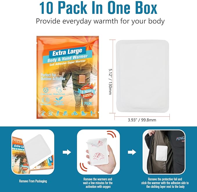 Hand Warmers, Extra Large Hot Hands & Body Warmers with Adhesives 10 Packs - Portable Pocket Warmers Disposable Hot Pads Camping Hand Warmer for Winter Outdoor Skiing Hiking