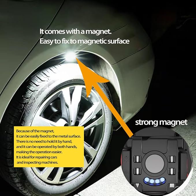 - đĄăMagnetic COB Work Lightă- The cob work light has a strong magnetic attraction on the back, which can be easily attached to any metal surface. 180-degree adjustable stand allows you to place the cob light at different angles according to actual needs. The carabiner design allows you to hang the cob light. Help you free your hands and make your work more convenient.