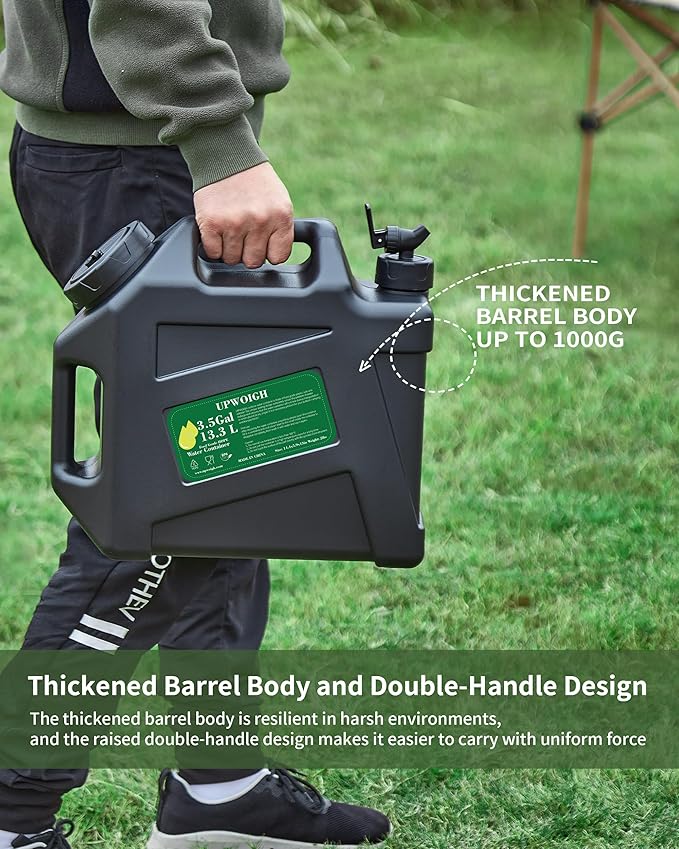 - Size:14.5x13.3x6in, Holding up to 3.5 gallons of water, this water jug ensures you have an ample supply of water for your outdoor adventures. Whether you're camping, overlanding, hiking, or traveling in an RV, this container provides enough water to sustain you and your companions.