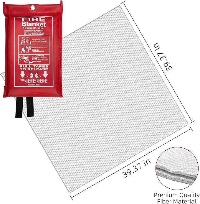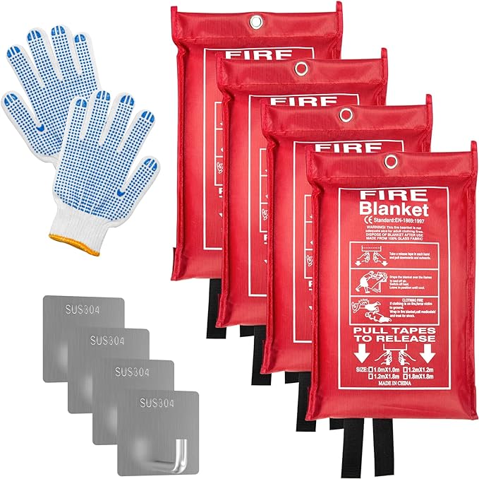 - ItIncluded: 4 PACK 39.3×39.3 Inches(1*1m)Fire Blanket, 4 Attachable hooks and A pair of gloves. NOTE: There are fiberglass on the surface of the fire blanket, please bring gloves when you check it, please do not scratch.