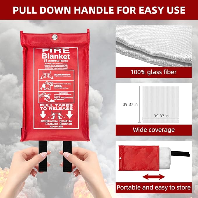 - EASY TO USE: Pull down the fire blanket,slowly cover the fire,(don’t pull back it right away),turn off the heat source,throw away it after the temperature is down.the fire cover is just for one-time use.Can be used simply without training.