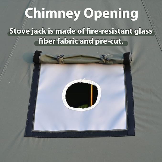 - 【More designs】①You can easily adjust the tension of the guy line by pulling the tension regulator; ②A pre-cut chimney opening allows you to use the stove in the tent, which can provide extra warmth even on snowy days; ③The tent goes with a plastic waterproof cap on the top of the door pole, effectively prevents rain from leaking through the metal hole
