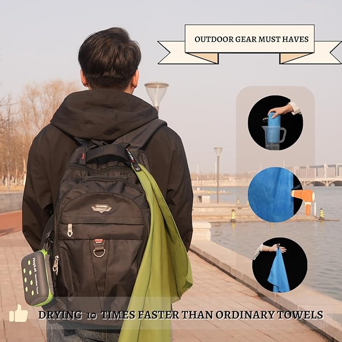 - 【Quick Dry and Great Absorbtion】Our microfiber towels have excellent water absorption properties. Whether you are sunbathing at the beach, camping in the mountains, or exercising at the gym, once you sweat or come into contact with water, the towel can quickly absorb and evaporate the moisture, keeping you dry and comfortable. In addition, its fast-drying performance is also excellent, drying 10 times faster than ordinary towels, great outdoor gear to carry around.