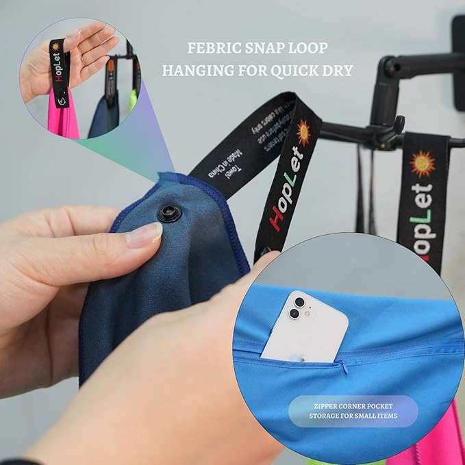 - 【Premium Microfiber Towel】The microfiber camping towel is designed with 100% microfiber, our skilled team of quality controllers ensures that each towel meets our stringent quality standards. The edge-trimmed microfiber towel is more durable and not easy to tread off. The snap loop with button can be hung up for drying anytime and anywhere. Zipper corner bag of the microfiber sport towel (M L XL XXL) can help you store small items such as mobile phones