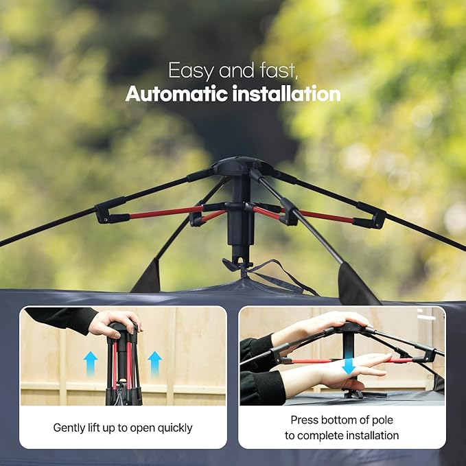 - ⏰【Quick Setup Automatic Tent】Unpack the 2 person tent, find a level surface, lay it flat, and unfold the four arms. Simply lift the tent's top, and it will automatically install itself. To ensure added stability, lock the top. This tent can stand on its own. Additionally, we provide stakes and windproof ropes for extra security. When your camping trip is over, simply press down on the two short poles at the top, and the tent will effortlessly fold itself.
