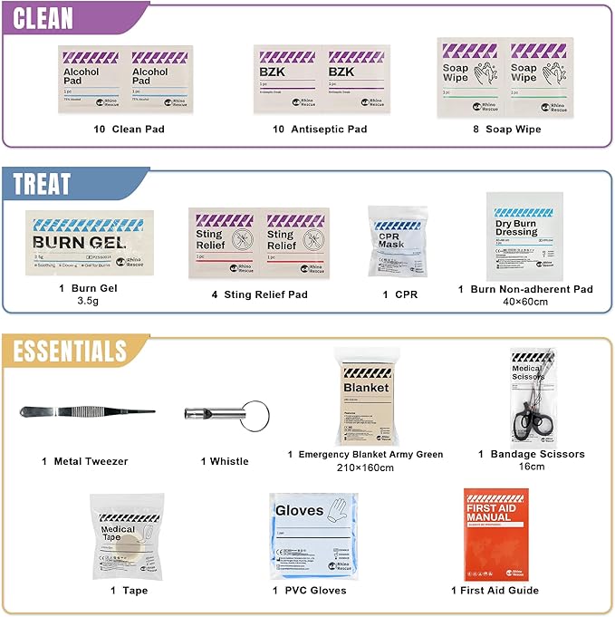 - 【First Aid Survival Kit---Great Solution to Outdoors Prepareness】 We interviewed outdoor experts and first aid pros to understand what gear they trusted day in and day out. During this process, we developed this handy emergency kit. RHINO RESCUE classic style small molle pouch is compact and portable. Most basic first aid and survival essentials are included in this kit. The first aid pouch is a must-have for your bug-out bag.