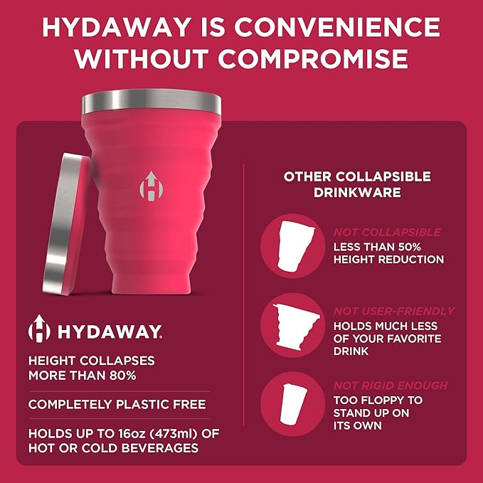 - Reduce Your Impact - HYDAWAY strives every day to lessen the impact of single-use plastic on the planet. With a practical and portable 16 oz camping cup tucked into your bag, you’ll never need a single-use plastic alternative again