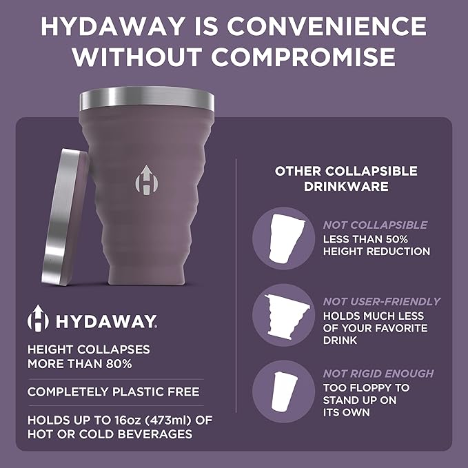 - Reduce Your Impact - HYDAWAY strives every day to lessen the impact of single-use plastic on the planet. With a practical and portable 16 oz camping cup tucked into your bag, you’ll never need a single-use plastic alternative again