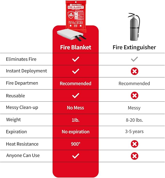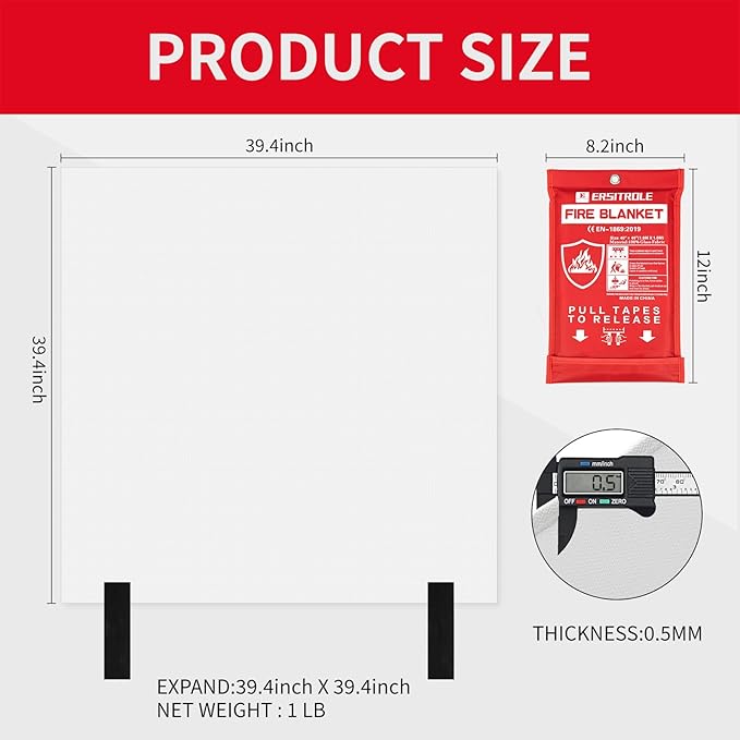 - 【ADVANTAGES OF USE】: Light weight, the fire blanket only weighs 1 lbs/430g, and expand size is 40" * 40", this fire blankets emergency for home is easy to carry and store, unlike ordinary fire extinguisher for home, the emergency fire blanket for home and kitchen can quickly and easily extinguish small fires without causing any mess in the kitchen or home, there is a hole slot on the bag so it can be easily hung on the wall as well, fire blankets do not have a shelf-life and can be stored for a long period of time.
