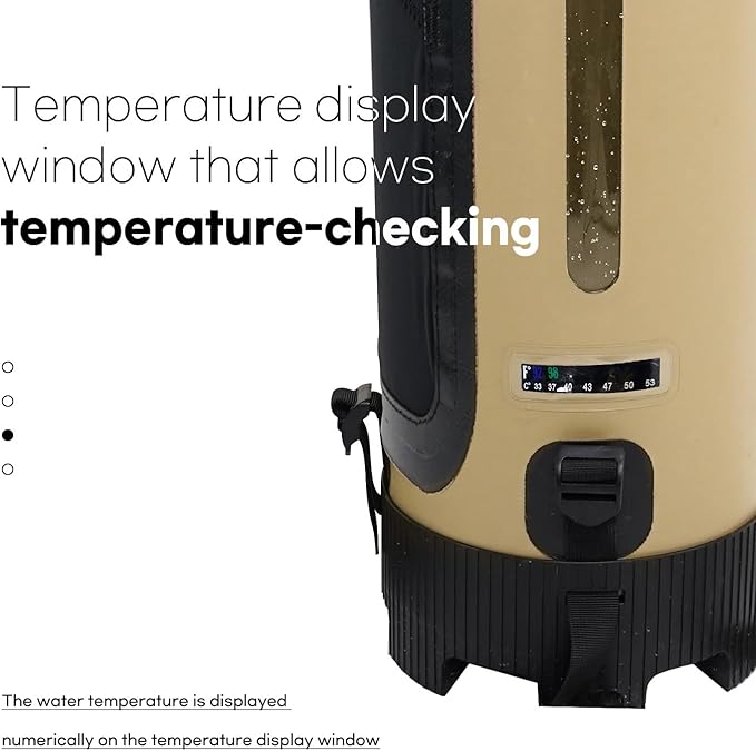 - đăTemperature Display WindowăMonitor water temperature with ease using the built-in display window on our shower bag for camping, perfect for outdoor activities like camping, beach showers, and more.