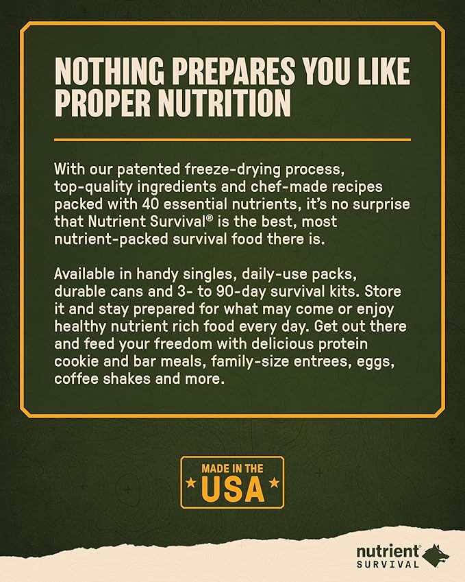 - GO-TO NUTRITION WHEN NEEDED: Nutrient Survival foods are American born and made, ensuring the best, healthiest and supremely delicious nutrition. Perfect for times of stress, a quick snack, elevating performance, travel, prepper supplies or living off-the-grid