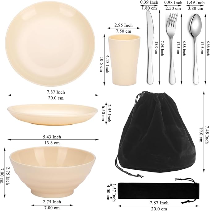 - GREAT VALUE SET: You will get a nice set of cutlery, the set includes 2 large plates, 2 bowls, 2 large capacity cups and 2 sets of stainless steel cutlery, the cutlery includes knives, forks and spoons.