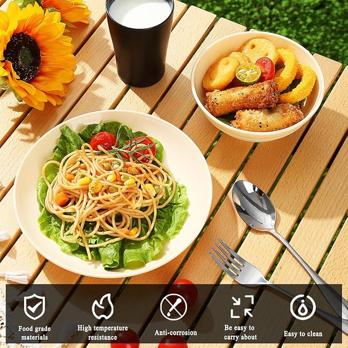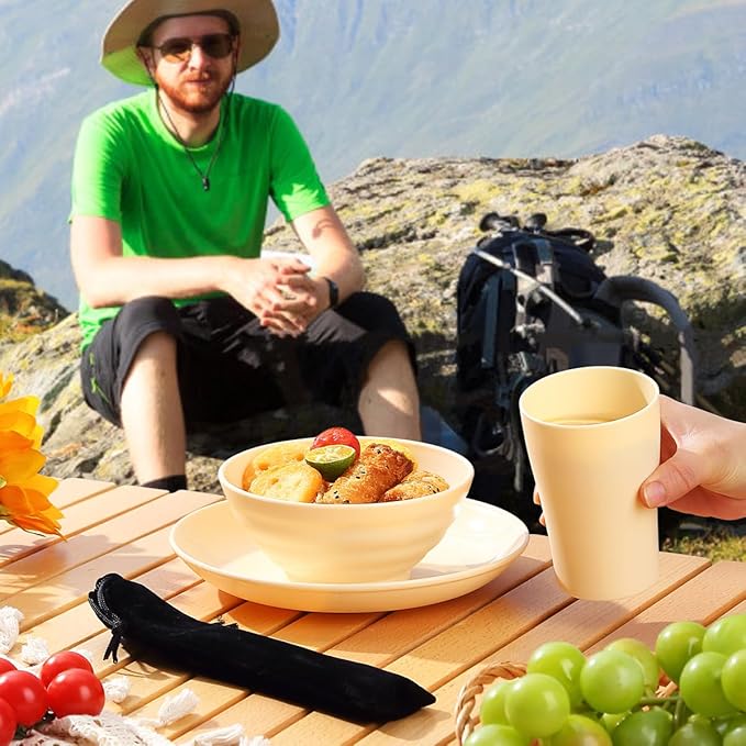 - HIGH QUALITY: The plates and cups of this camping set are made of pp material, BPA free, non-toxic and odourless. They are lightweight, unbreakable and sturdy, the stainless steel cutlery is made of high quality stainless steel, sturdy and durable.
