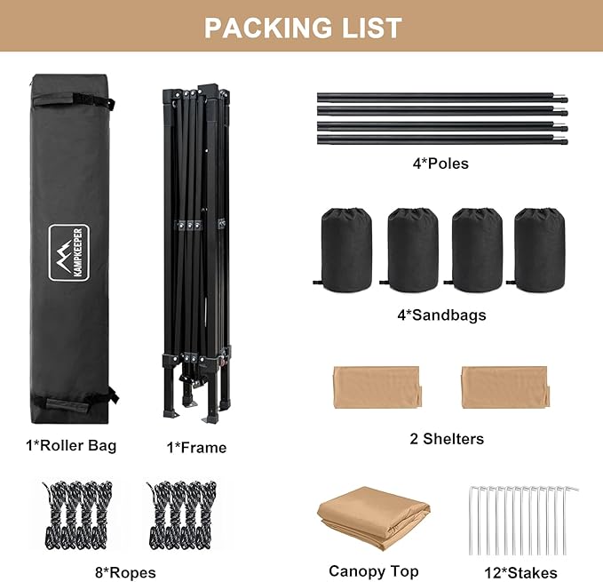 KAMPKEEPER 10x10 pop up Canopy Tent with 2 sidewalls Silver-Coated,Outdoor Canopy Tent for Parties with 2 Shelters,with 4 Poles, 4 Sandbags,8 Ropes,12 Stakes,and 1 Roller Bags