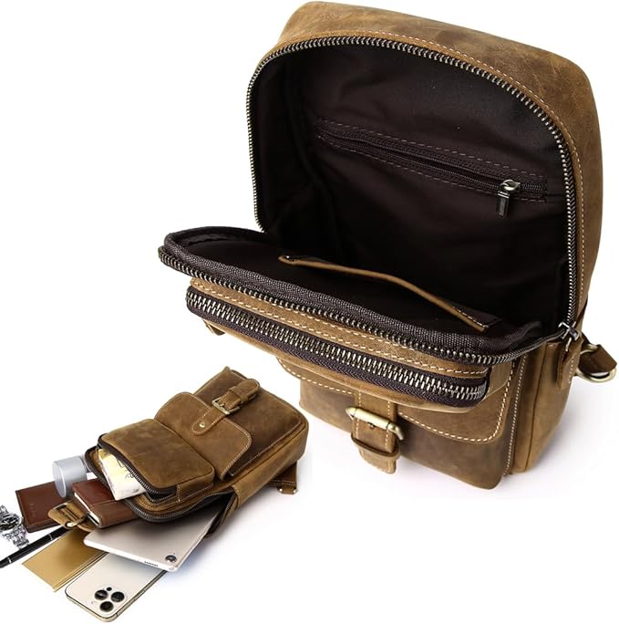 KPYWZER Sling Bag Men Women Vintage Full Grain Genuine Leather Shoulder Backpack Satchel Chest Casual Daypack Crossbody Outdoor Day Pack Backpacks Brown