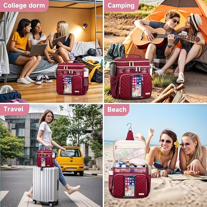 • 【Upgraded Portable Shower Caddy With Hanging Hook】This upgraded shower caddy college dorm room essentials,bring convenience to your life,Compared to the standard shower bag, it adds a separate compartment at the top for small cosmetics, toothpaste and toothbrush, the strong metal hook on the top, can hold up to 15 kg, The shower bag is high-quality and new design, classic shape and popular color, the large opening design of this makeup organizer bag is more convenient to take,and easily store your full-size toiletries, cosmetics and daily items
