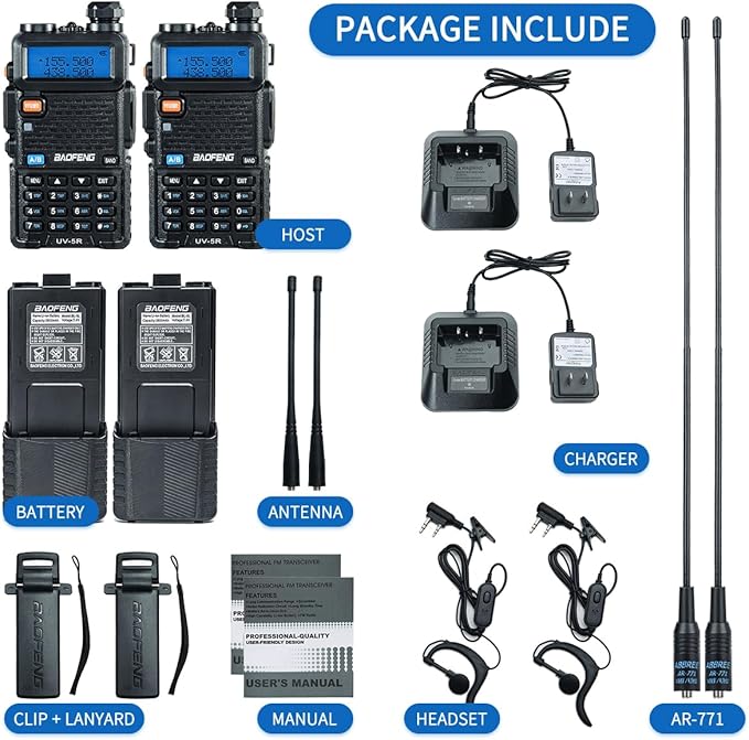 - Package Include:2XRadio;2XAR-771;2X3800mAh Battery;2XHeadset;2XBelt;2XLanyard;2XUS Charger;2XManual