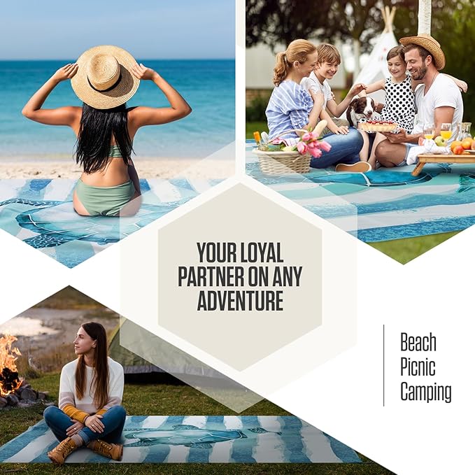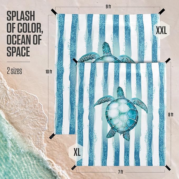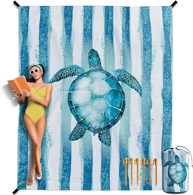 VENTURE 4TH Family-Size Beach Blanket: Sandproof, Waterproof, Lightweight & Compact. Includes Stakes and Carry Bag. 7x8 feet XL Striped Turtle