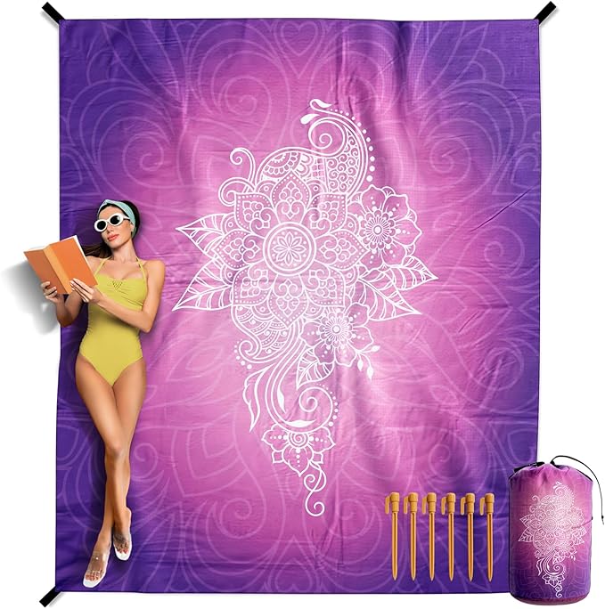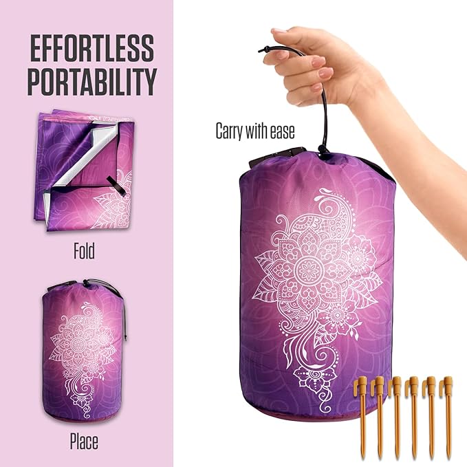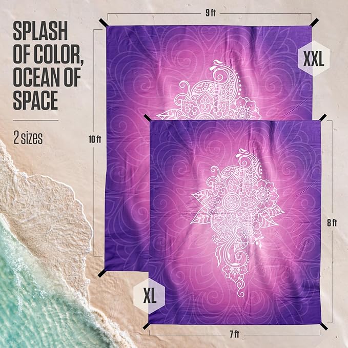 VENTURE 4TH Family-Size Beach Blanket: Sandproof, Waterproof, Lightweight & Compact. Includes Stakes and Carry Bag. 7x8 feet XL Purple Mandala