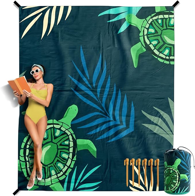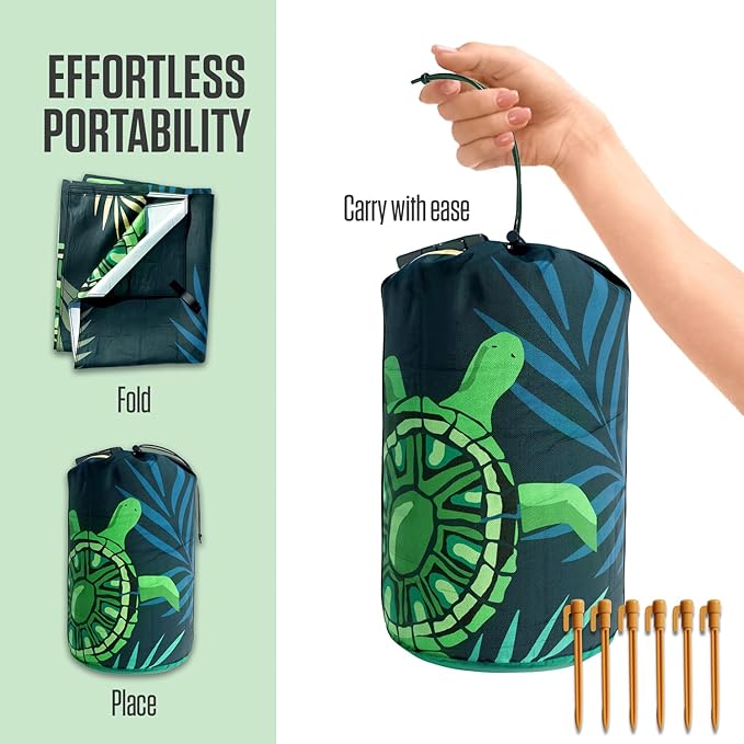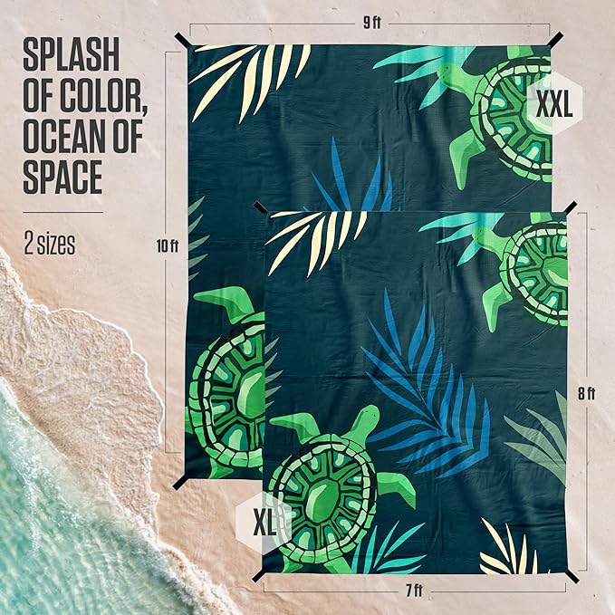 VENTURE 4TH Family-Size Beach Blanket: Sandproof, Waterproof, Lightweight & Compact. Includes Stakes and Carry Bag. 7x8 feet XL Navy Turtle