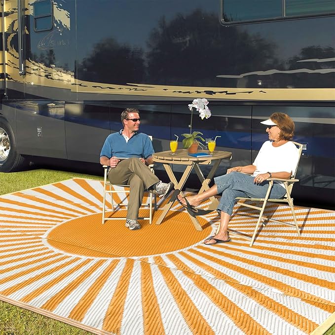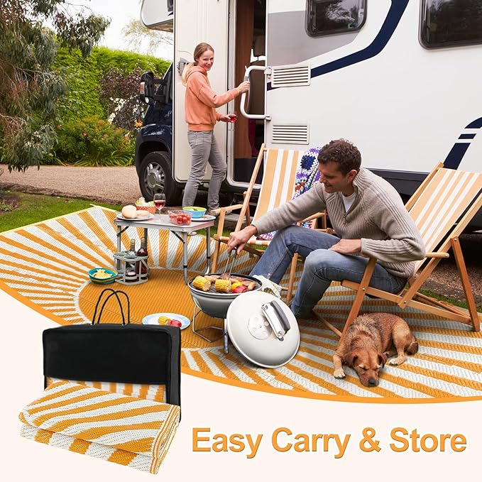 - [Versatile Outdoor Rug] The large outdoor rug is woven from a breathable, comfortable plastic material that won't damage your deck or lawn. Ideal for patio, deck, garden, backyard, balcony, camping, picnics, tent, RV road trips, beach and indoor rooms