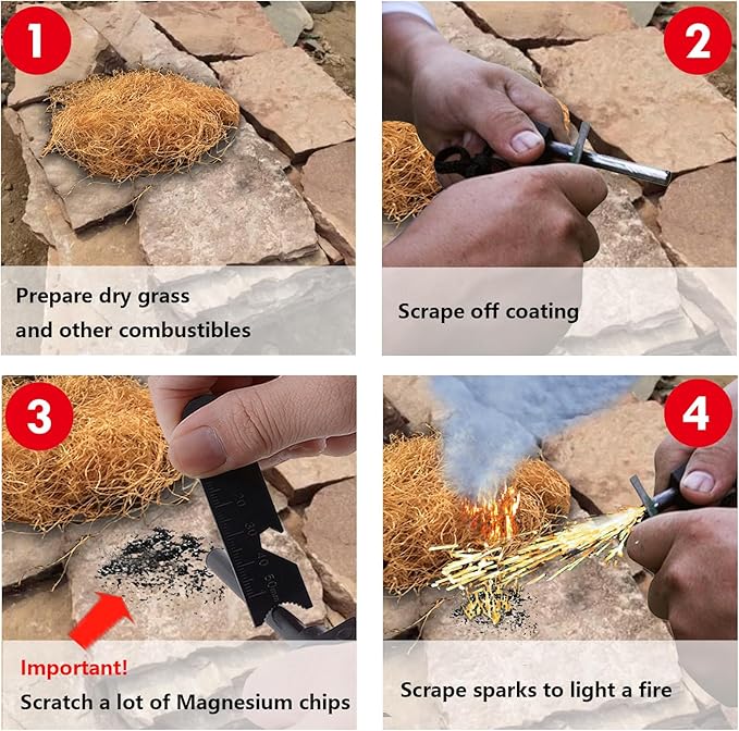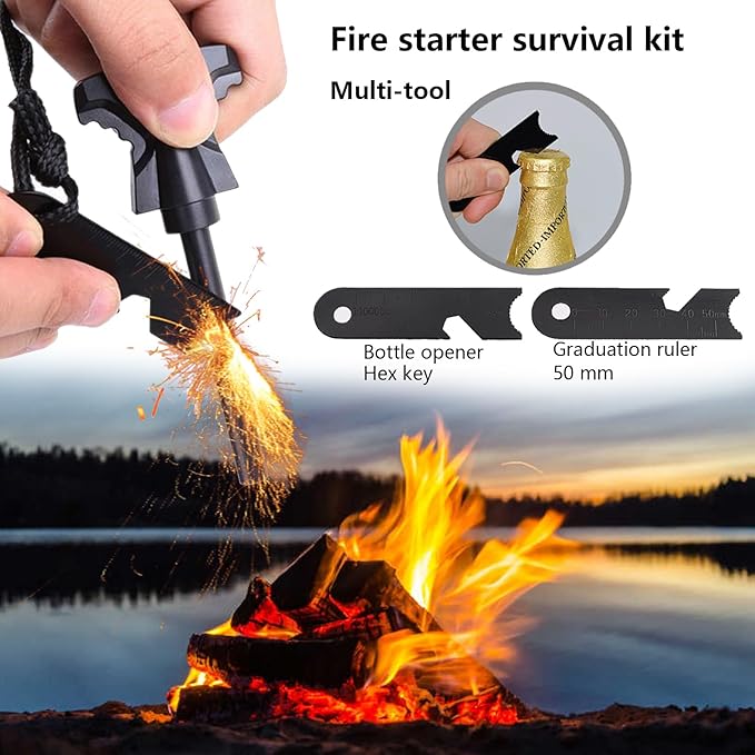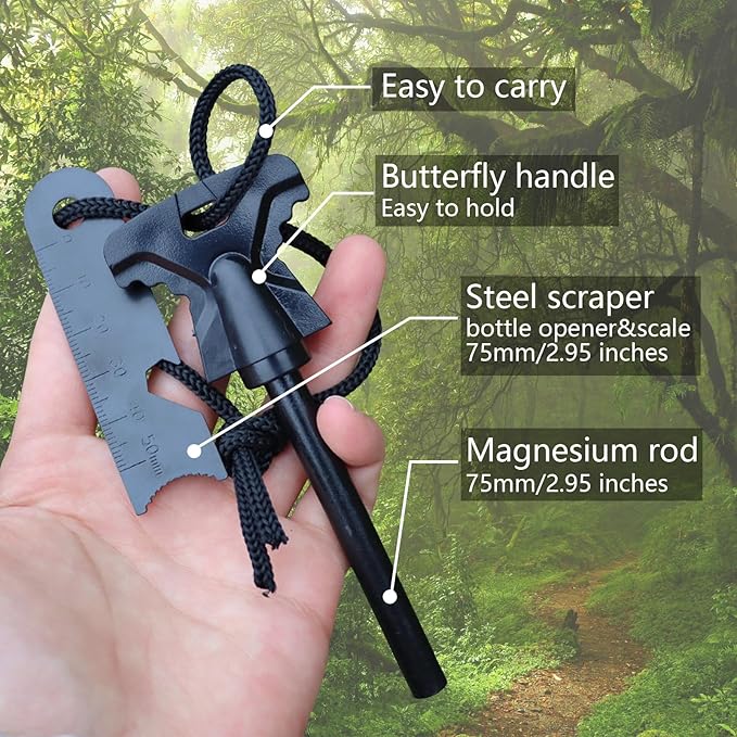 - All-Weather Performance: The ferro rod fire starter kit is made of high quality magnesium stick with multifunction steel scraper, waterproof and corrosion resistant. Quickly and easily start a fire in any conditions. A perfect emergency fire stater tool for fireplace, bushcraft, hiking, hunting, camping, BBQ, EDC, Emergency Rescue, etc.