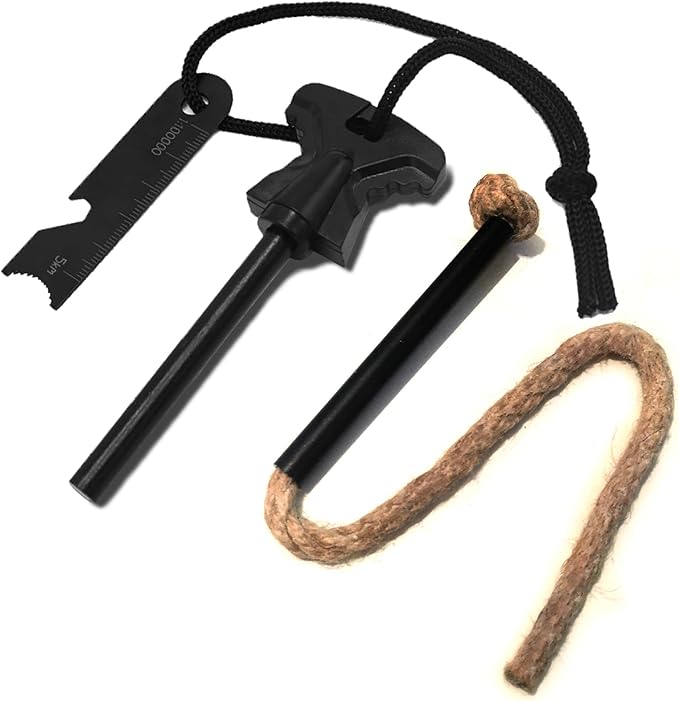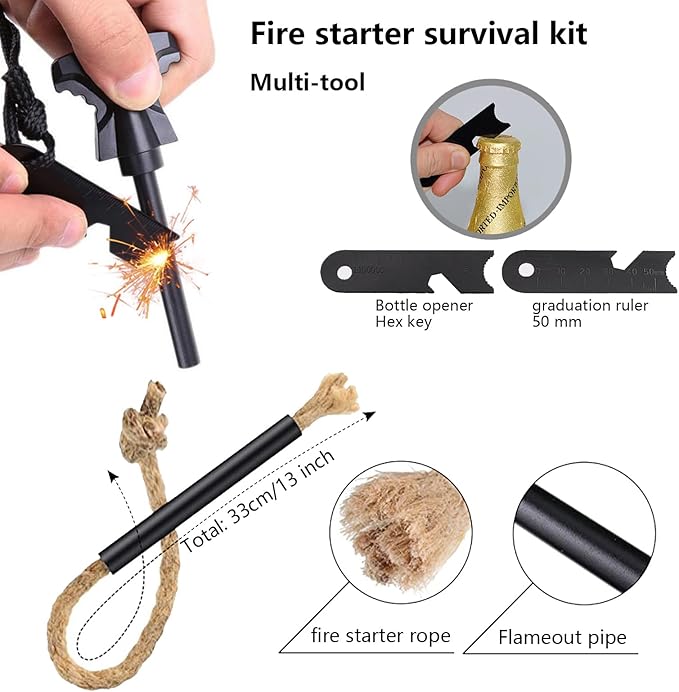 - Easy to Use: The fire starter kit with tinder hemp rope is simple and intuitive operation, suitable for beginners and experienced outdoor enthusiasts alike. Egnomic handle design for easy grip, and perfect size of magnesium rod for striking, You can make fire sparks easily to light a fire for wilderness survival.