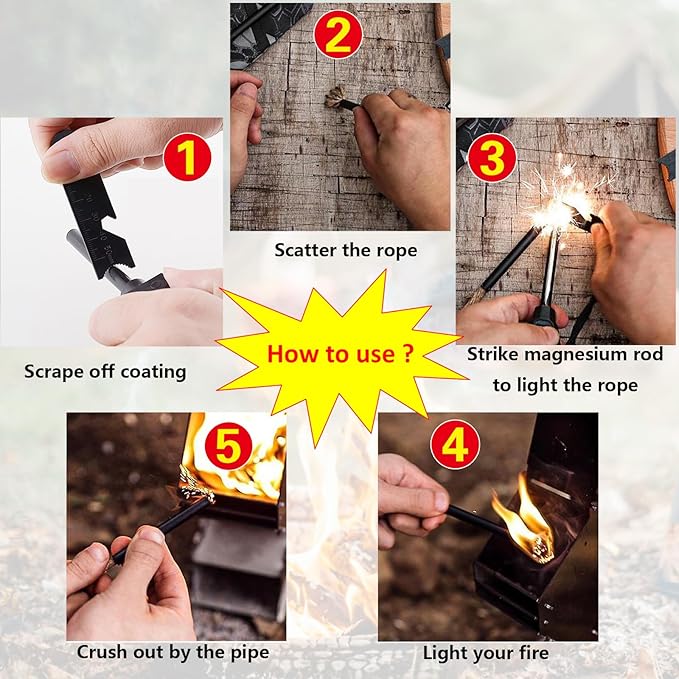 - All-Weather Performance: The ferro rod fire starter kit is made of high quality magnesium stick with multifunction steel scraper, waterproof and corrosion resistant. Quickly and easily start a fire in any conditions, even if there were no dry combustible materials. A perfect emergency fire stater tool for fireplace, bushcraft, hiking, hunting, camping, BBQ, EDC, Emergency Rescue, etc.