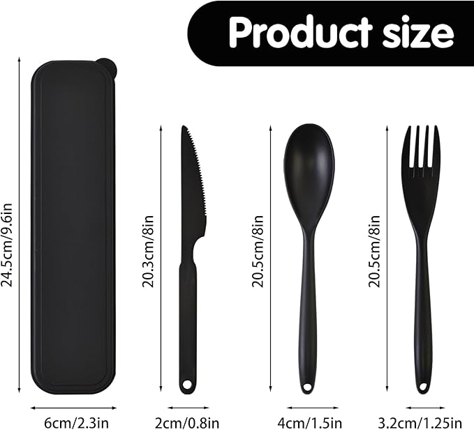 - 【Reusable Cutlery Set with Case】 Portable cutlery set is included one fork, one spoon, and one knife.The size of the case is 9 inches, and the size of the knife, forks and spoons are both 8 inches.