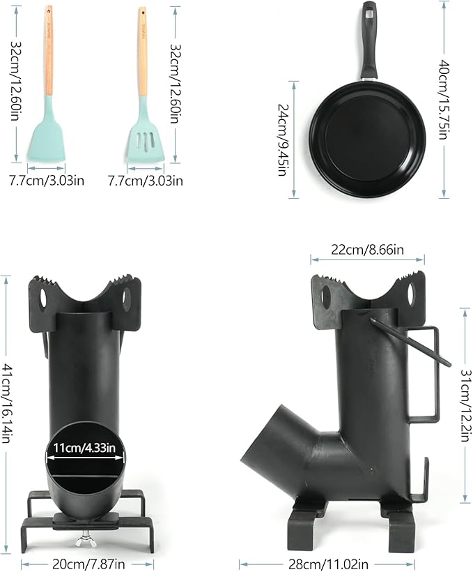 - Size: Burn Tube: 11.02”L x 7.87”W x 12.20”H, Pot Holder: 8.66”L, Frying Pan: 9.45 ”D x 15.75”L(with the handle), Silicone Turner: 3.03”L