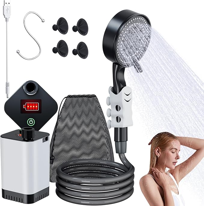- LONG LASTING BATTERY: The shower Pump Features IPX7 water-resistant and USB Rechargeable, built in high capacity 5200mAh battery and power button and display, you can simply charge the pump via the included USB cable and enjoy a gentle shower up to 90 minutes