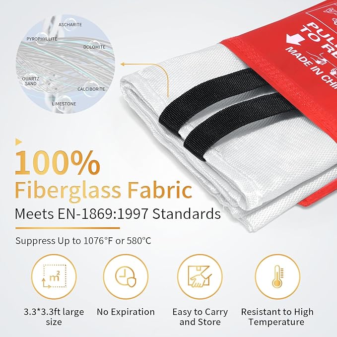 - Premium Quality Material: Our emergency fire blanket is made from 100% fiberglass fabric and meets EN-1869:1997 standards. Protects from heat source and flames, ensuring maximum safety in the home