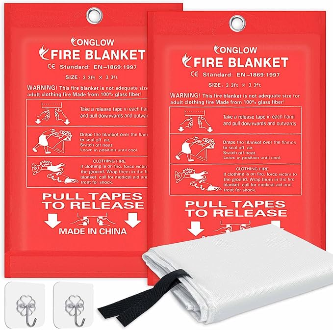 - Package Include: Comes with 2 pack fire blankets sized 3.3x3.3ft and 2 adhesive hook. Conveniently to hanging in the kitchen, camping gear, office, grill area, or wherever you may need it