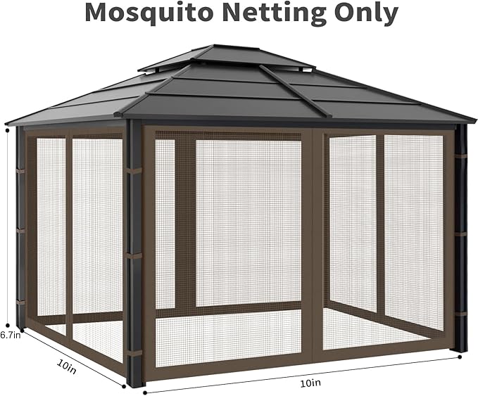 - 【DIMENSION】10 ft (L) x 10 ft (W) x 6.5 ft (H). The universal gazebo replacement netting will make your outdoor activity joyful. Please measure the size of your gazebo before purchasing