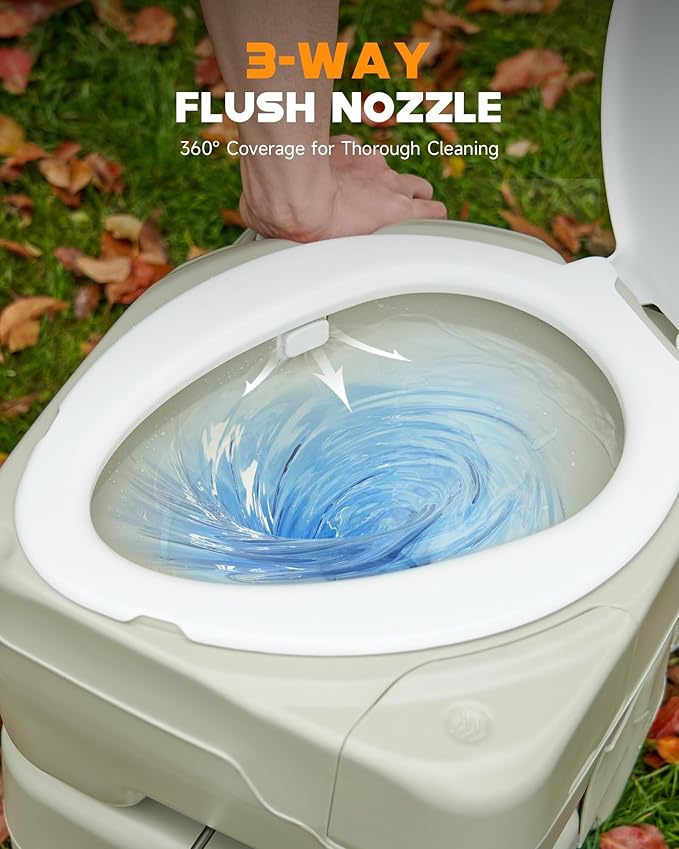 - 𝟑𝟔𝟎-𝐃𝐞𝐠𝐫𝐞𝐞 𝐅𝐥𝐮𝐬𝐡𝐢𝐧𝐠: The 3-way flush nozzle and high-pressure bellows pump provide full coverage for thorough cleaning with each flush. With a 2.9 gal. water tank allowing about 100 flushes and a spacious 5.3 gal. waste tank, this RV toilet offers convenience for extended stays.