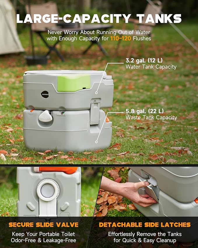 - 𝐑𝐮𝐠𝐠𝐞𝐝 & 𝐑𝐞𝐥𝐢𝐚𝐛𝐥𝐞: Made from durable HDPE material, this outdoor toilet is designed to withstand the rigors of outdoor use while supporting up to 440 lb. Its slide valve effectively seals odors and prevents leaks for a hassle-free experience.