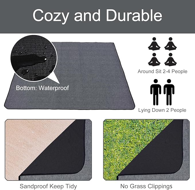 - WATERPROOF AND SANDPROOF – Our large outdoor blanket is waterproof, moisture-proof, more wear-resistant due to water-resistant PEVA bottom, which keep you away from any humid moister and beach dampness ground, make you seat more comfortable. Say goodbye to all that annoying sand and grass.