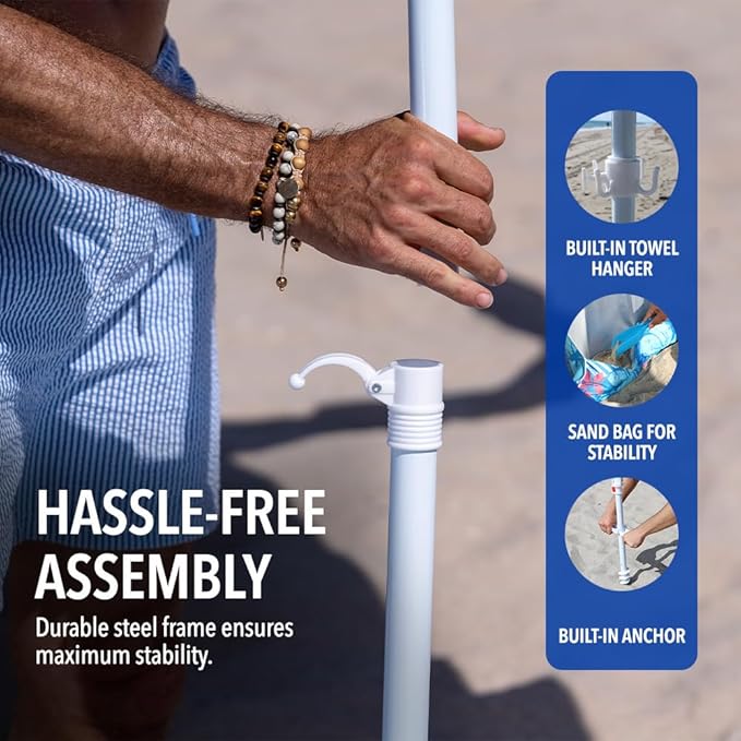- EXTRA FEATURES FOR CONVENIENCE: Relax in style with built-in sandbags for stability, a towel hanger, and an umbrella table tray for your essentials. Keep your gear organized and enjoy seamless comfort under this heavy-duty portable sunshade.