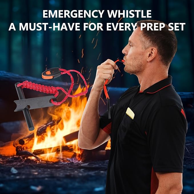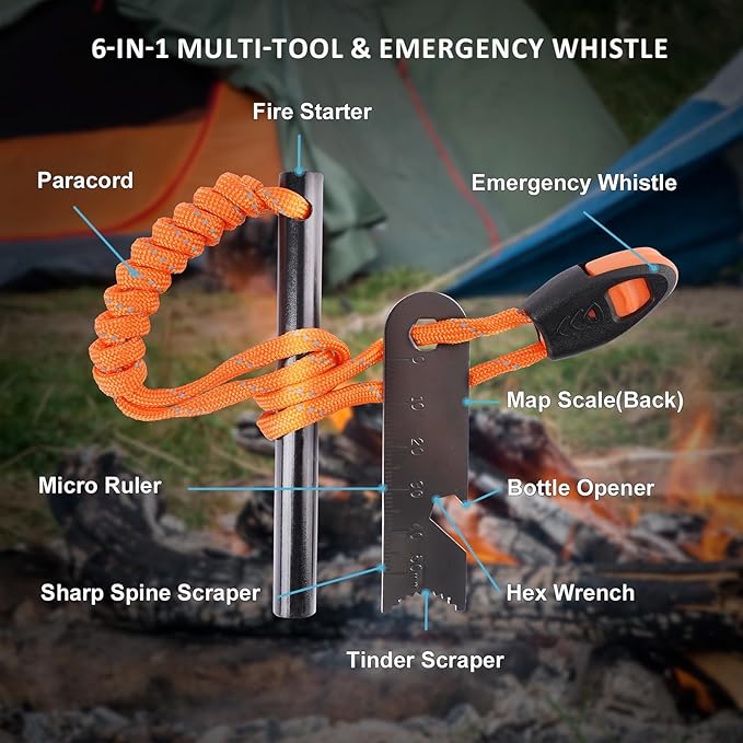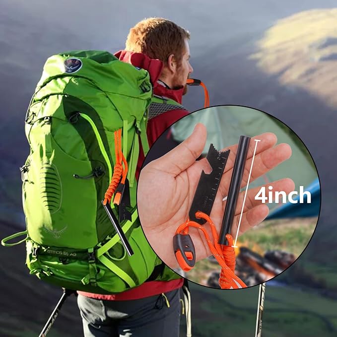 - 【6-IN-1 Multi-Tool with Emergency Whistle】The Ferro Rod Kit comes with a 6-in-1 multi-tool striker. The striker serves multiple functions including a tinder scraper, map scale, ruler, hex wrench, and bottle opener. Additionally, it features an emergency whistle, making it a valuable survival tool.