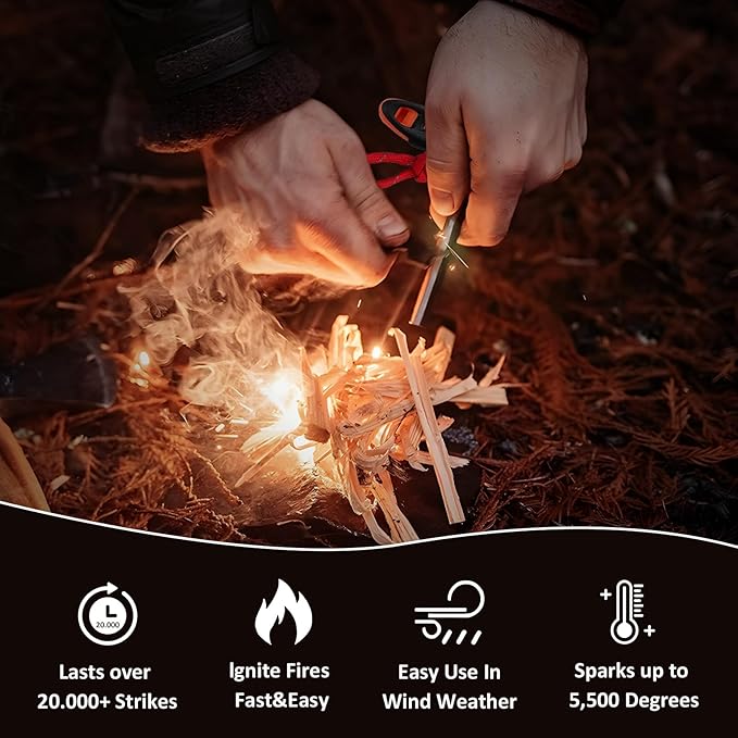 - 【Highly Effective】The high-quality iron and magnesium mixture used in the fire starter allows for sparks up to 5500ºF. This ensures reliable ignition of tinder in any weather conditions and at any altitude. The kit is designed to last over 20,000 strikes, providing long-lasting use.