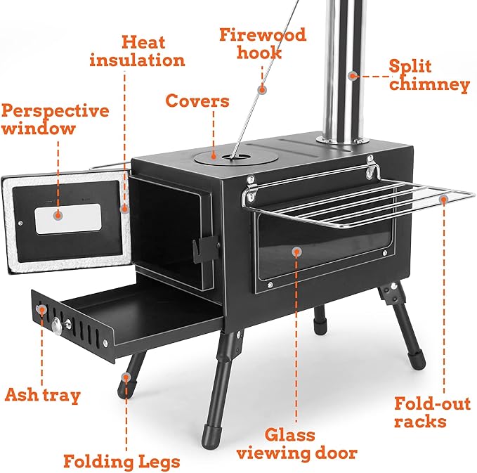 - 🐛【Easy to carry and clean】--One-piece molding, instant use without installation. Folding shelves on both sides add to the functionality of the stove, which can be used to place cutlery and dry items, and also serve as handles for easy portability. --The chimney and other parts can be stored in the stove, saving more storage space. The foldable legs at the bottom also make it easy to store and transport. --Equipped with ash tray for easy cleaning of ashes at the bottom.
