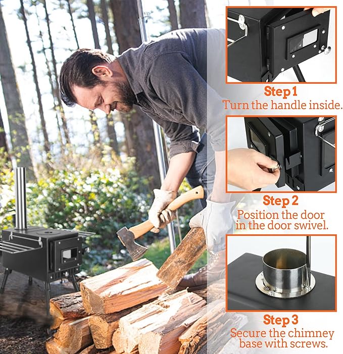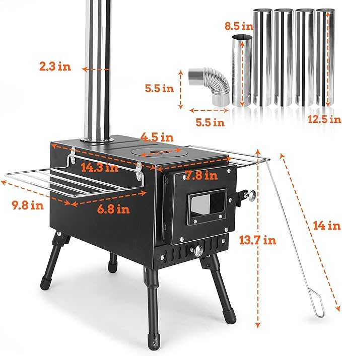 - ⛓【Stainless Steel Chimney Pipe】-- Equipped with 5x chimney pipes for stability and proper ventilation. Available for bell tents with furnace tube vents; chimney tubes adjust ventilation to suit your heat needs. The design of the fire holes on the surface of the stove also increases the heating efficiency and is a great version for your camping/hunting trips with friends or family.