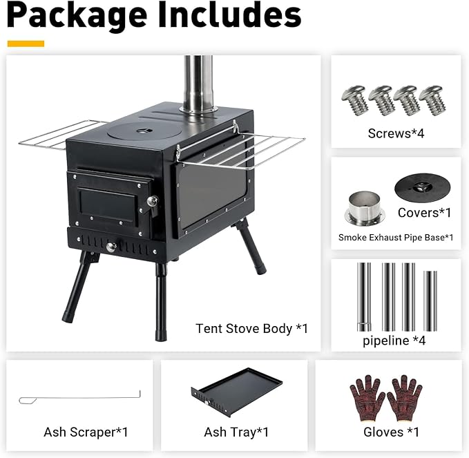 - ⛓【Stainless Steel Chimney Pipe】-- Equipped with 4x chimney pipes for stability and proper ventilation. Available for bell tents with furnace tube vents; chimney tubes adjust ventilation to suit your heat needs. The design of the fire holes on the surface of the stove also increases the heating efficiency and is a great version for your camping/hunting trips with friends or family.