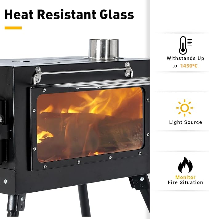 - 🔐【Heat output regulator】--The damper design can help you control the amount of heat by adjusting the heat output and help the fuel to burn more fully. --Pyrex windows can be removed and cleaned quickly, with visible flame and wood in the stove.