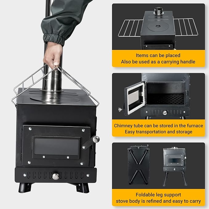 - 🐛【Easy to carry and clean】--One-piece molding, instant use without installation. Folding shelves on both sides add to the functionality of the stove, which can be used to place cutlery and dry items, and also serve as handles for easy portability. --The chimney and other parts can be stored in the stove, saving more storage space. The foldable legs at the bottom also make it easy to store and transport. --Equipped with ash tray for easy cleaning of ashes at the bottom.